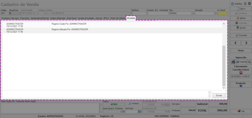 Na aba de Atividades estará registrada todas as alterações feitas na venda, assim permitindo que o admistrador da empresa consiga verificar o que foi feito e por quem foi feito naquela venda.