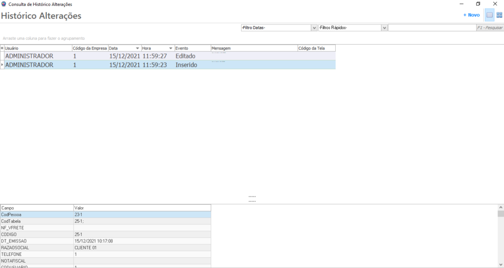 Ao dar duplo clique sobre um registro irá abrir a tela Histórico de Alterações, onde estará detalhado quais campos foram alterados. Mostrando o valor original e o valor pelo qual foi alterado.